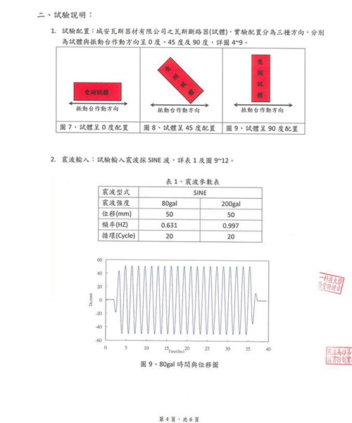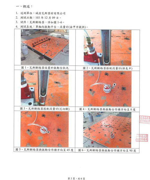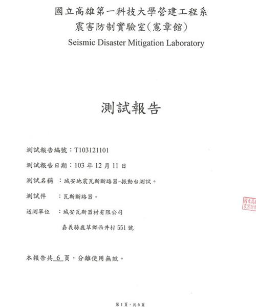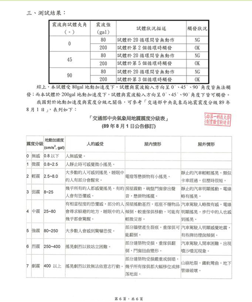 æ¸¬è©¦çµæžœ:模擬地震震度é”到5ç´š(200gal),採 0° 45° 90°三種角度進行測試,å‡å¯ç«‹å³é®æ–·ç“¦æ–¯ï¼Œå®Œå…¨æ©Ÿæ¢°çµæ§‹ç„¡éœ€é›»åŠ›è¼”åŠ©ã€‚